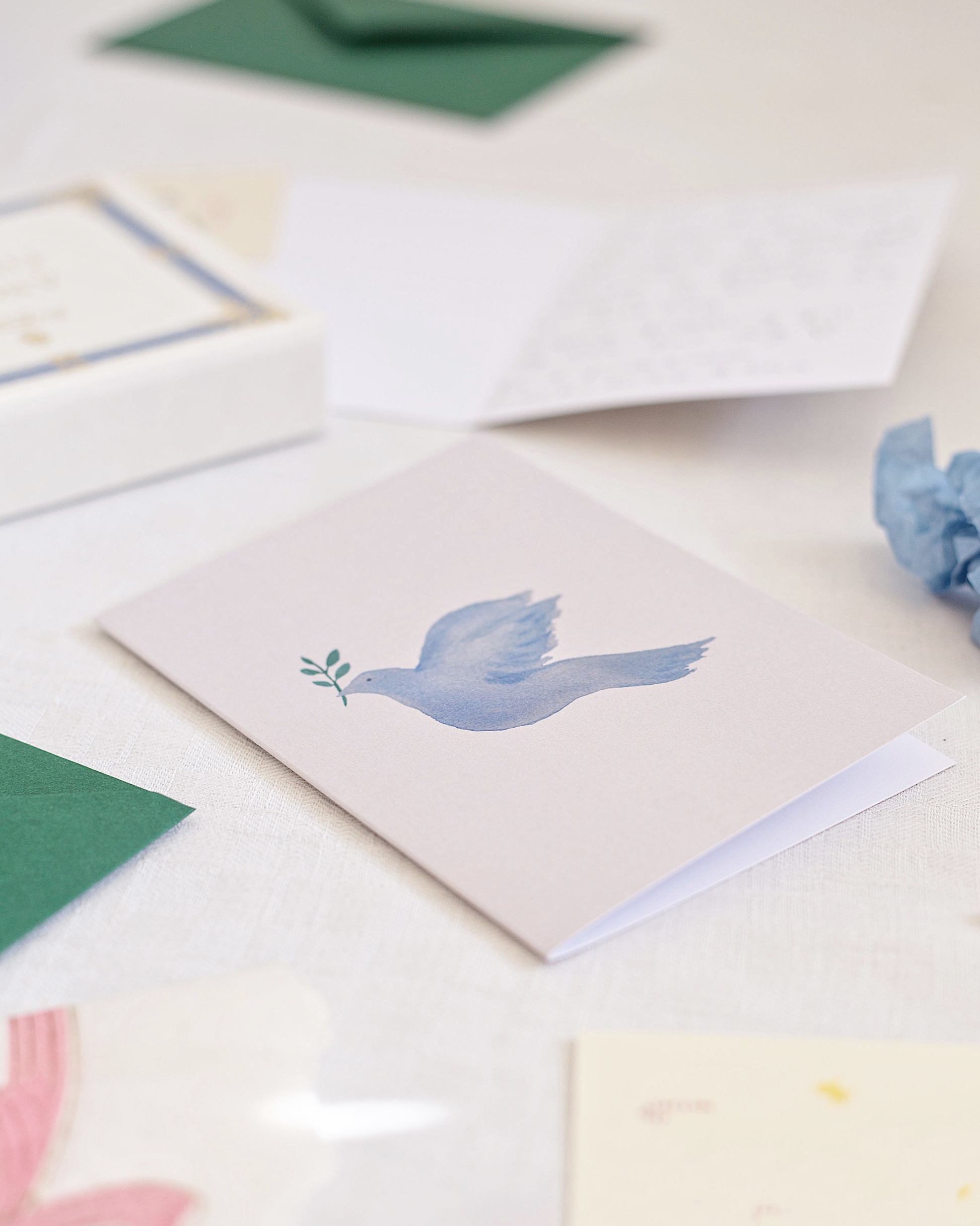 Send en kærlig hilsen og bring glæde og håb med dette kort, som er smukt illustreret med en fin fredsdue malet med akvarel.