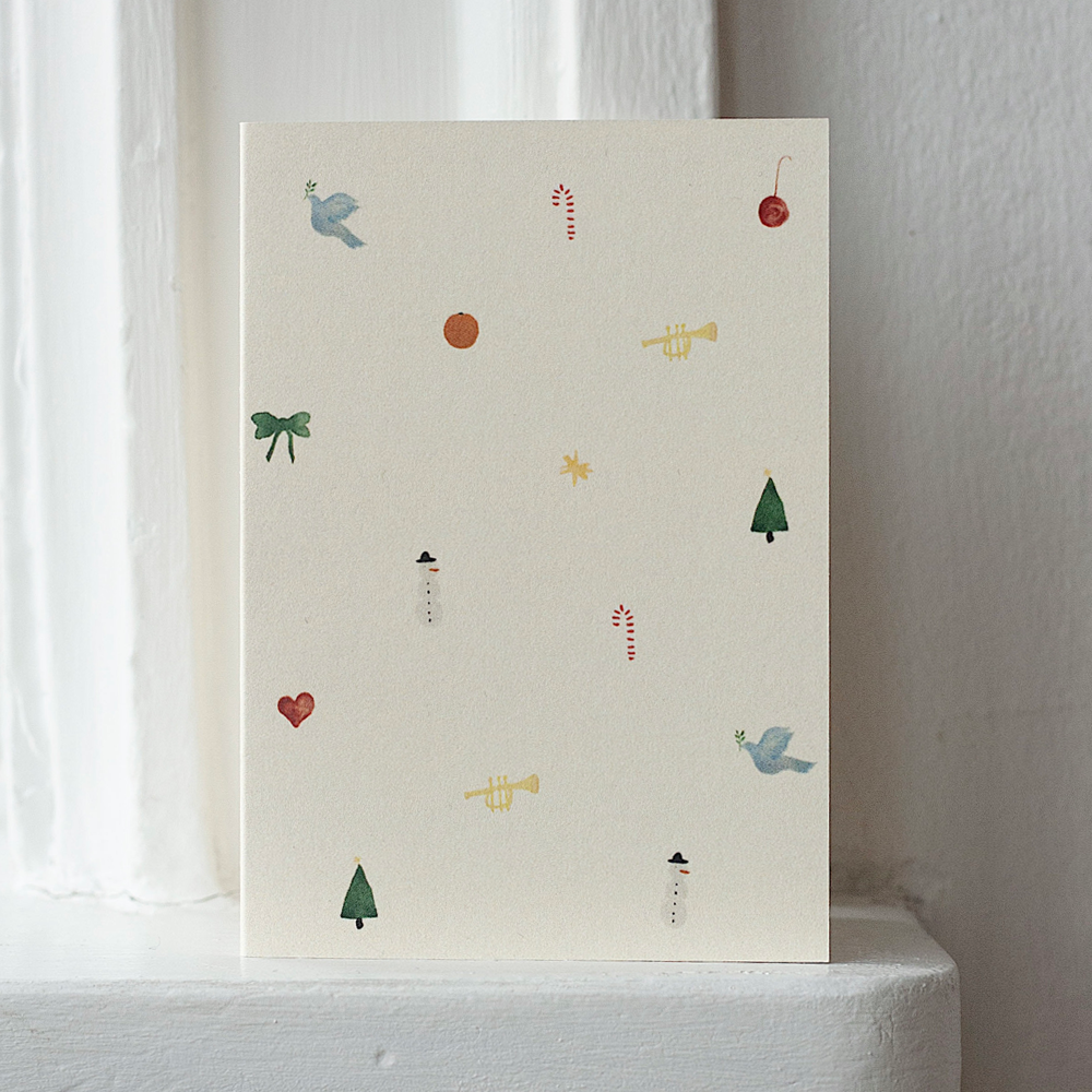 Gør gaven ekstra særlig med dette julekort, som er smukt illustreret på både for - og bagside, med små, fine, håndmalede tegninger i akvarel.