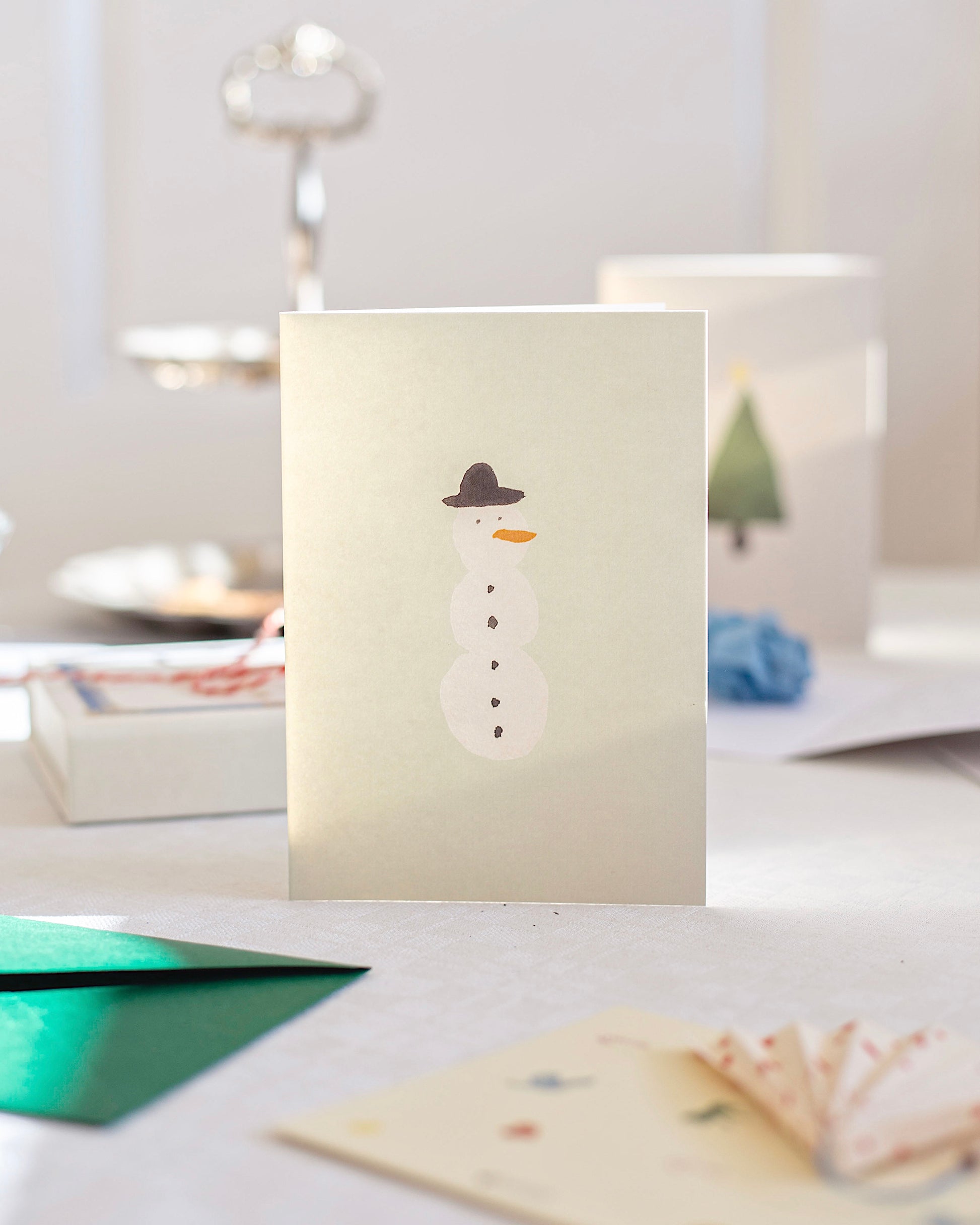 Send en kærlig julehilsen og bring glæde med dette julekort, som er smukt illustreret med en fin snemand malet med akvarel.