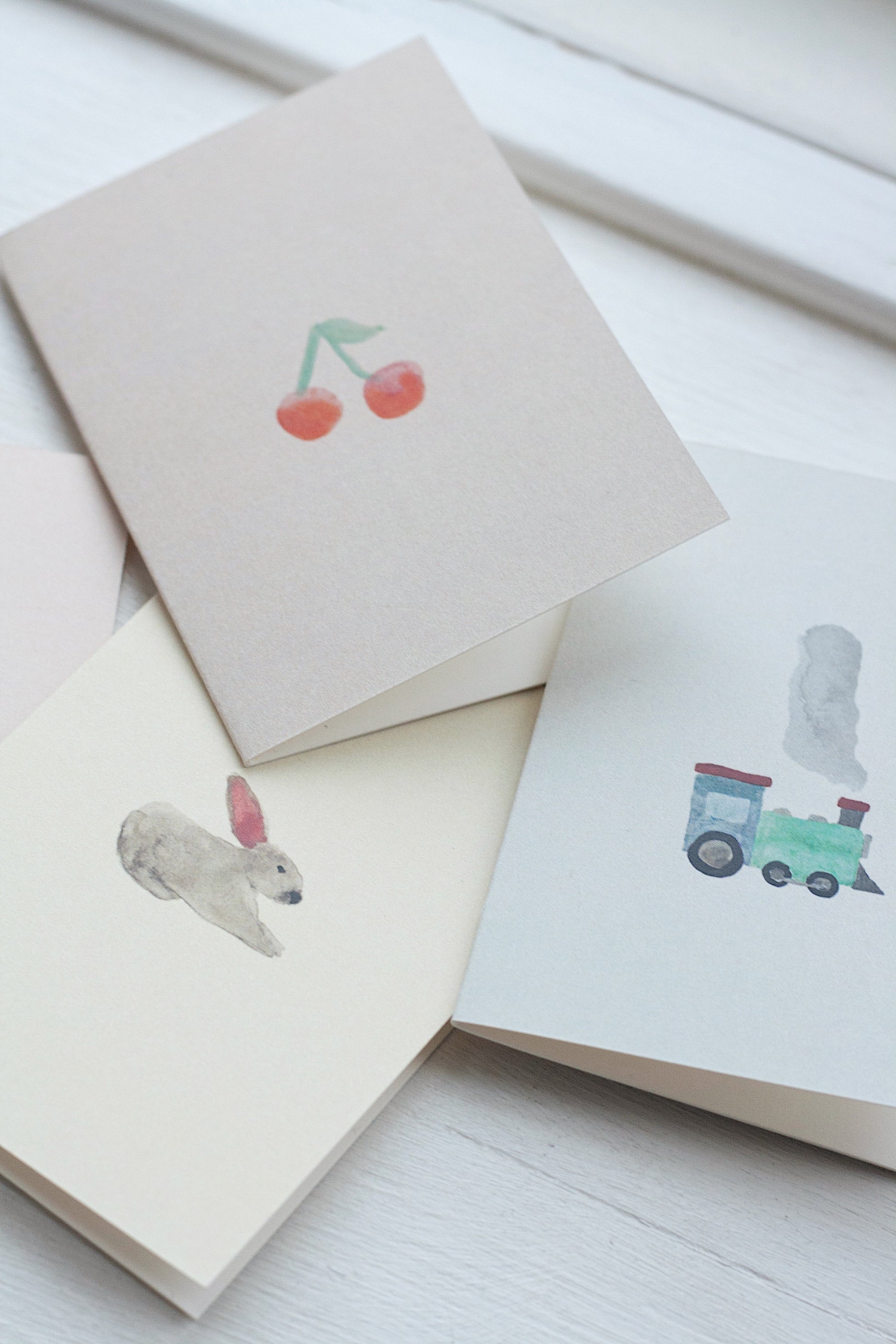 Bring glæde med dette kort, som er smukt illustreret med et fint, lille kirsebær malet med akvarel.