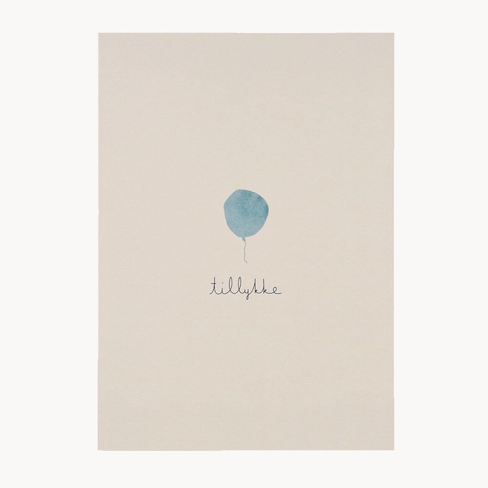 Bring glæde med dette kort, som er smukt illustreret med en fin, håndmalet blå ballon i akvarel med teksten 'tillykke' under.