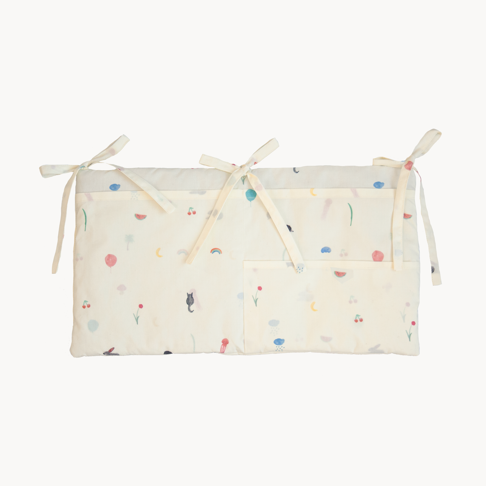 Denne elegante sengelomme kan nemt bindes på babysengen, så sutter, flaske, babyalarm og andre nødvendige ting hurtigt kan findes frem. Den kan også bruges på børnesengen, ved puslepladsen eller i bilen. Med en stor lomme og to mindre rum tilbyder lommen masser af praktisk opbevaringsplads.