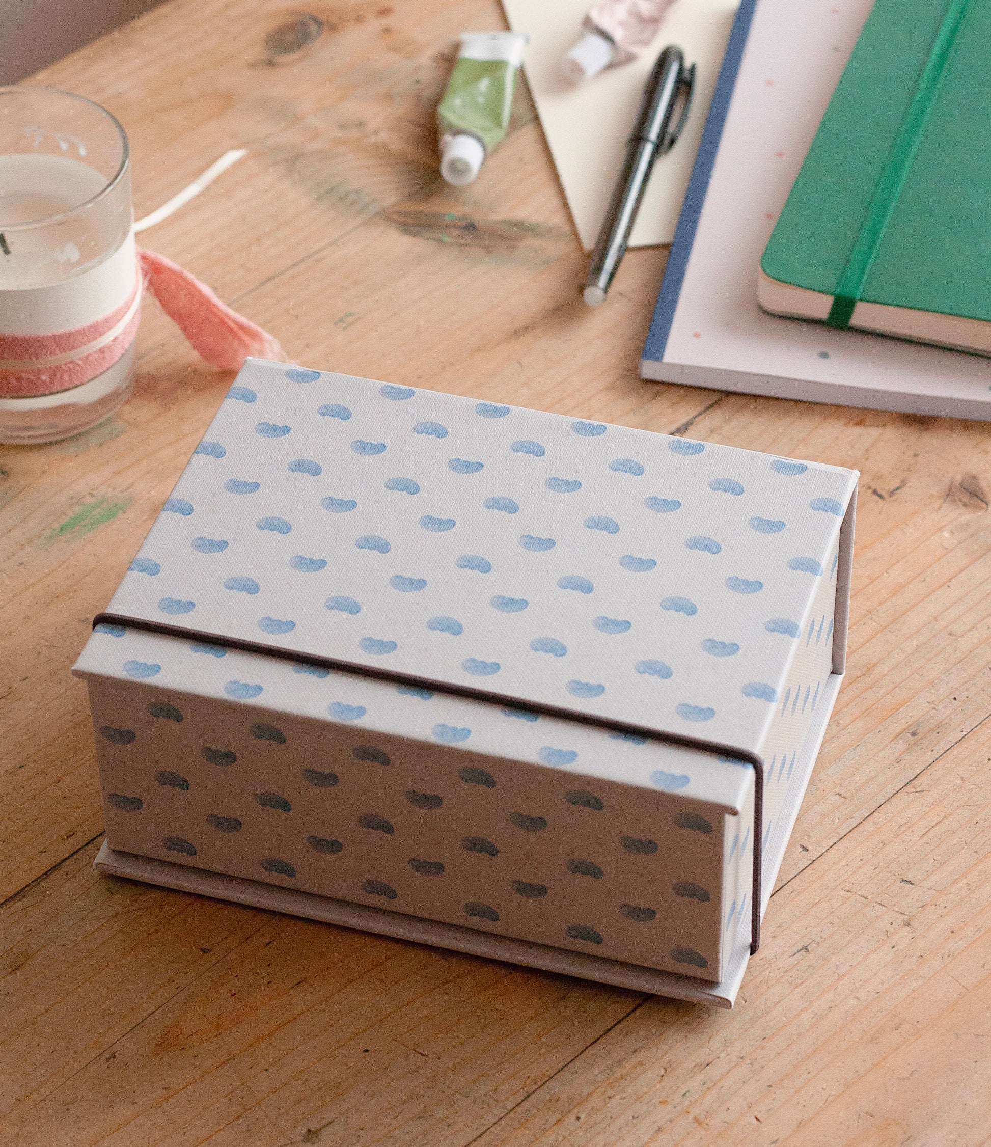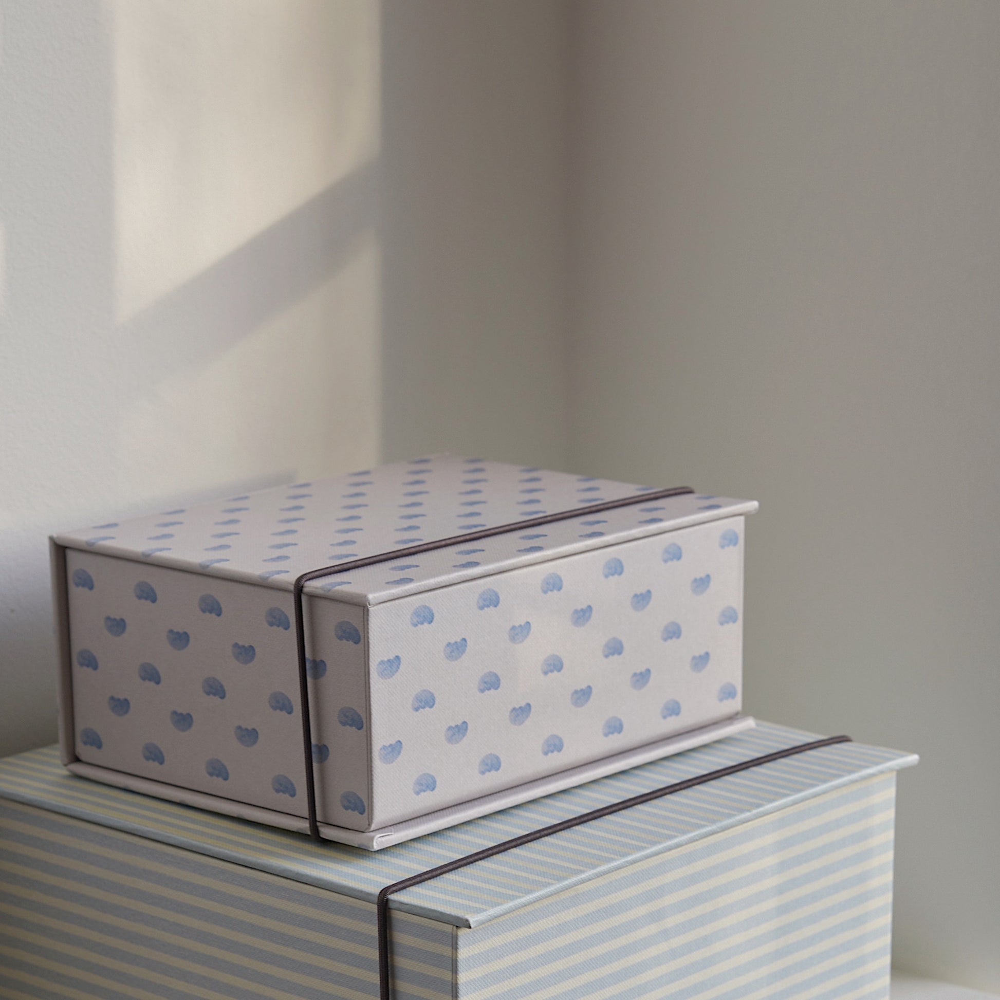 Opbevaringsæske med Specialdays håndmalede, små skyer på beige baggrund.