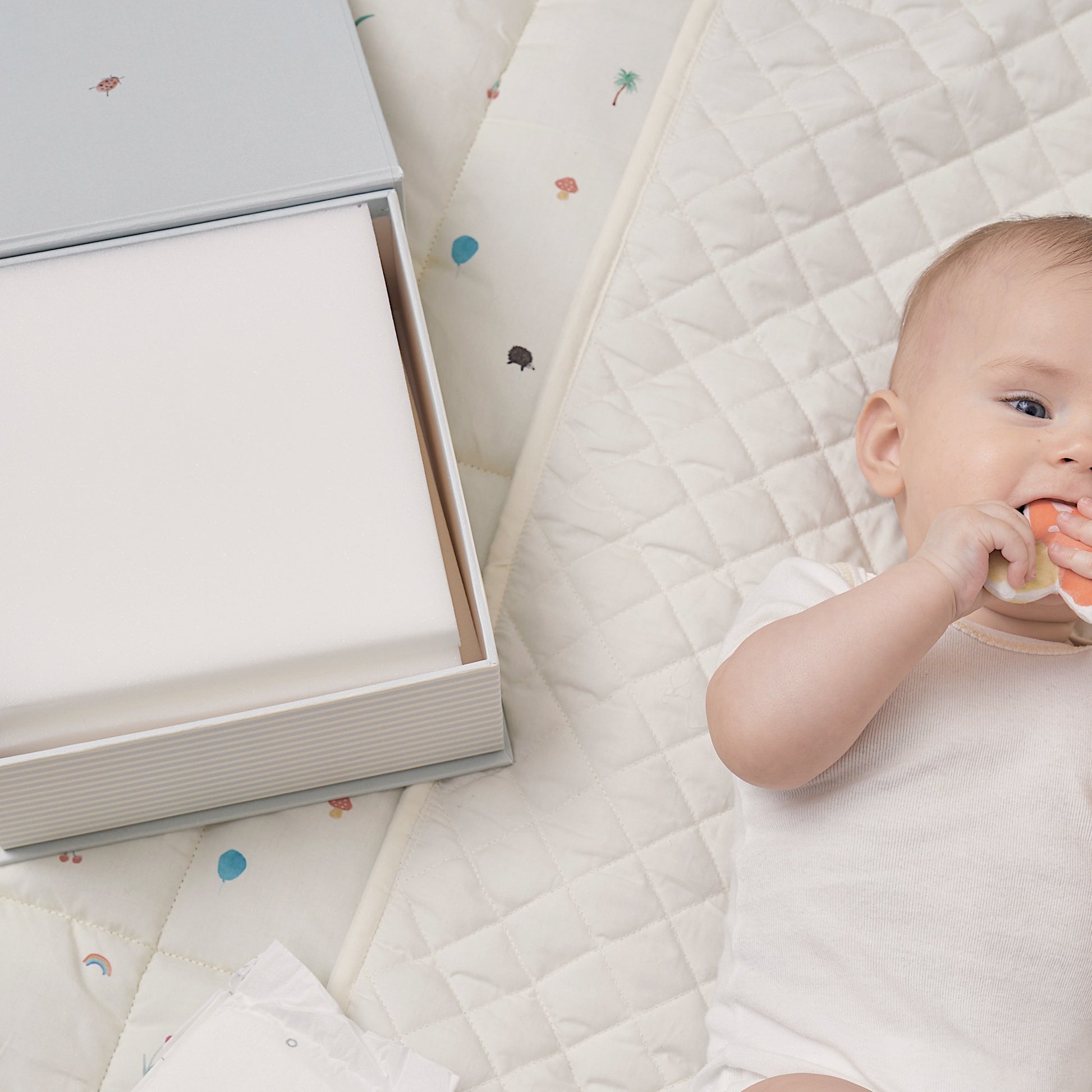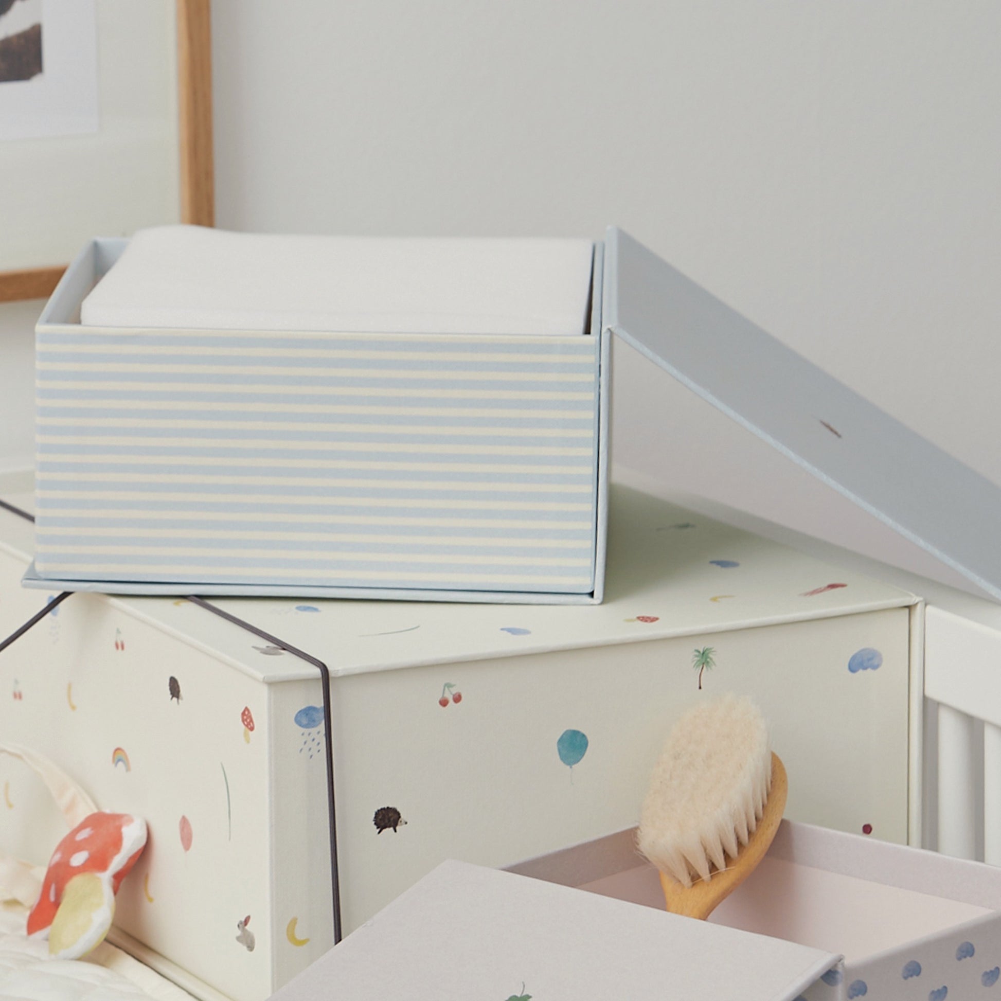 Opbevaringsæske med Specialdays håndmalede, cremefarvede striber på lyseblå baggrund.