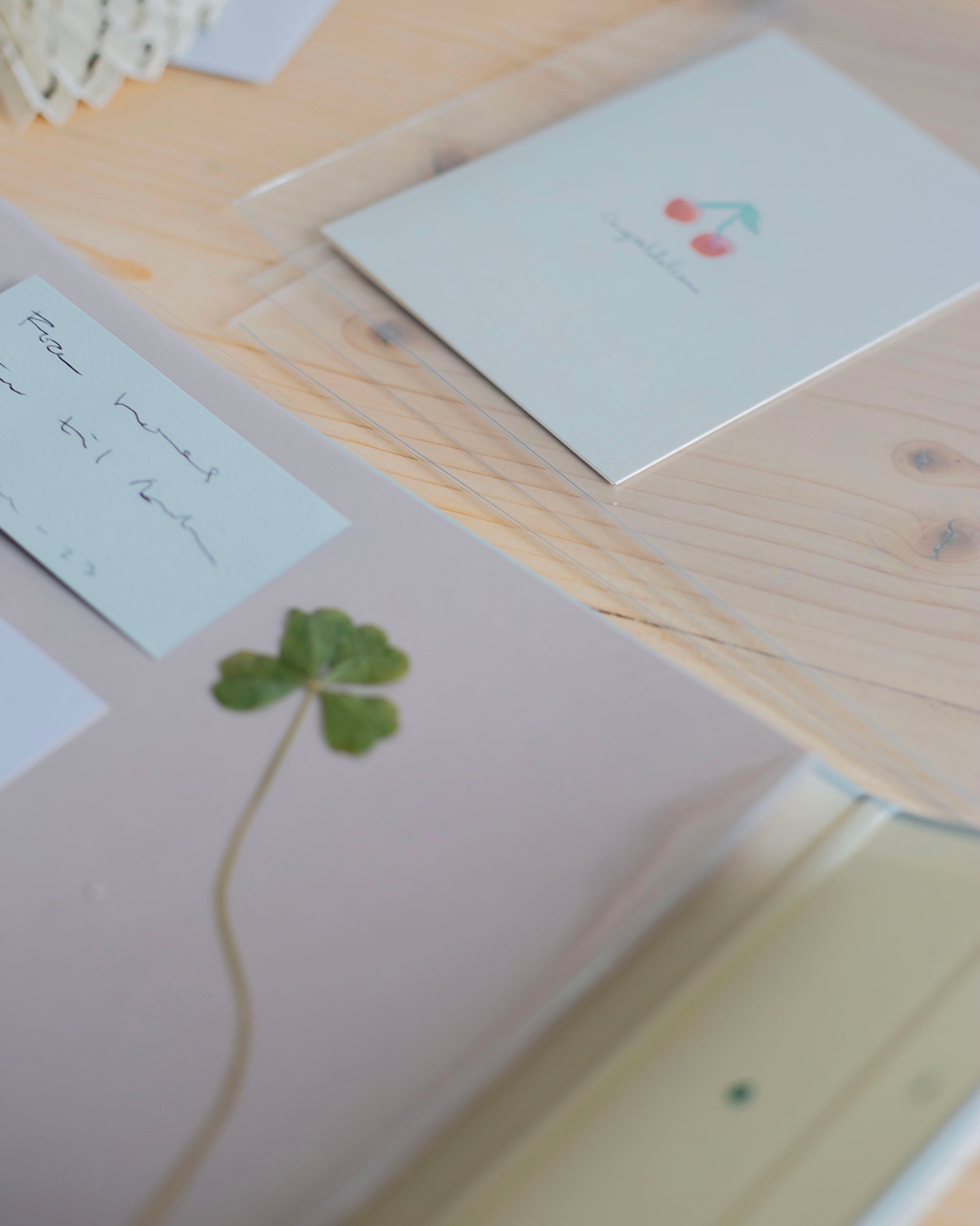 Du får 10 stk. gennemsigtige plastiklommer lige til at sætte ind i bogen og dermed mere plads til udklip, tegninger og kære minder.